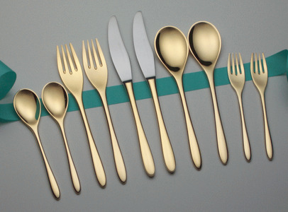 材質:18-10ステンレス 仕上げ:オールミラー仕上げ(24金メッキ) 内容:ディナーナイフ(共柄)鋸刃付(約223㎜、重量59g)×2本 ディナーフォーク(約190㎜、47g)×2本 ディナースプーン(約189㎜、55g)×2本 ティースプーン(約141㎜、26g)×2本 ケーキフォーク(約141㎜、21g)×2本 ※箱サイズ:38×255×68㎜