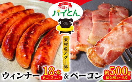 東村産アグー豚「パイとん」 ・ウインナー6本×3パック ・ベーコン 1枚およそ100~160gの個包装パックが4~5枚 計約500g ※真空パックでお届けします。 ※ベーコンは大きさや形、重さが不揃いな物の中からおまかせとなります。大きさや重さは選べませんのでご了承ください。 [■提供事業者:やんばる肉店]