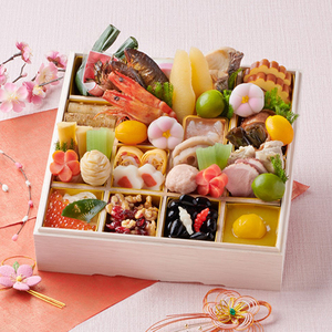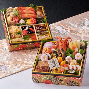 おせち二段重(3人様) 容器サイズ 22×22センチ 内容 全40品 祝箸3膳/取り箸1膳/金箔入り梅昆布茶3個付き 【お品書き】 <壱の重> ロブスター和風ソース添え 子持ち鮎甘露煮 葉付完熟金柑ロップ煮 練り金団 寿栗甘露煮 紅白蒲鉾 伊達巻 紅白梅かんざし 鰆柚庵焼 数の子 翡翠梅甘露煮 合鴨ワイン煮 花餅梅 鶏松風 鰻柳川真丈 錦紙巻 梅小川巻 龍皮巻 <弐の重> 蓮根旨煮 筍土佐煮 松笠慈姑白煮 蕗青煮 梅人参 棒鱈 海老団子 海老艶煮 鶏八幡巻 厚焼きチーズ玉子 鰊昆布巻 海老真砂マヨネーズ和え 烏賊松前漬 敲き牛蒡 黒豆蜜煮 紅白千代呂木 紅白膾 いくら醤油漬 音羽透かし昆布 クランベリー胡桃 田作り 蟹身海鮮甘酢和え ※ロブスターの角(ヒゲ)が折れている場合がございます。大変申し訳ございませんが、ご了承ください。