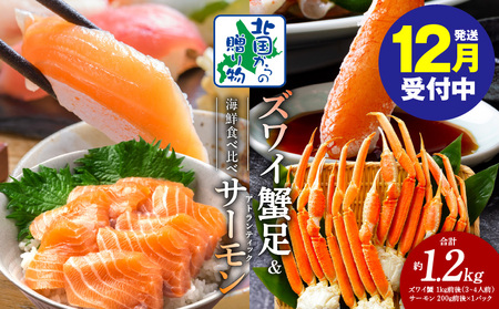 【年内発送】ズワイガニ足 1kg 3-4Lサイズ 蟹酢付 昆布塩加工 & アトランティックサーモン 200g 海鮮食べ比べセット