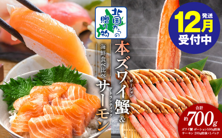 【年内発送】本ズワイガニ ポーション 500g 生食可 蟹酢付 & アトランティックサーモン 200g 海鮮 食べ比べセット