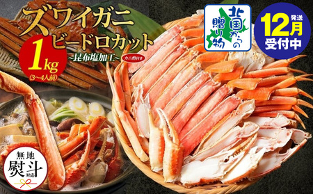 【年内発送】本ズワイ 1kg前後 3-4L ビードロカット 蟹酢付 昆布塩加工 ポーション 無地熨斗