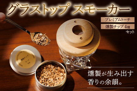 ・グラストップスモーカー ・プレミアムトーチ ・燻製チップ4種類セット(桜、オーク、ヒッコリー、りんご)