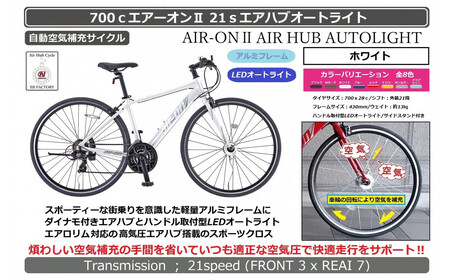 700cエアーオン2エアハブオートライト ・アルミフレーム ・タイヤサイズ:700x28c ・フレームサイズ:430mm ・シフト:シマノ外装21段変速 ハピソンLEDオートライトハンドル取付型 ・サイドスタンド付き カラーバリエーション:ホワイト