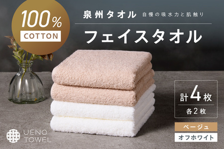 【泉州タオル】吸水力と肌触りが自慢のデイリーユースフェイスタオル オフホワイト・ベージュ 4枚【配送不可地域:北海道・沖縄・離島】【039E-101】