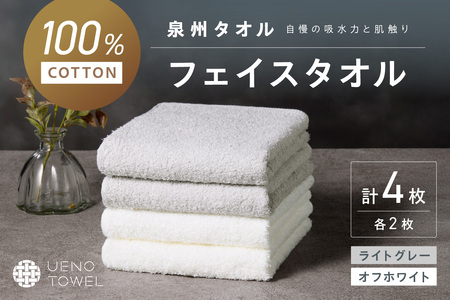 【泉州タオル】吸水力と肌触りが自慢のデイリーユースフェイスタオル オフホワイト・ライトグレー 4枚【配送不可地域:北海道・沖縄・離島】【039E-102】
