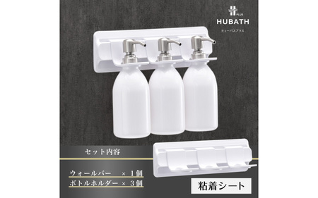 ◆商品内容◆ ────────────── ■HUBATH PLUS 粘着シート式Aセット カラー:ホワイト 【HUBATH PLUS 粘着シート式ウォールバー:1個】 ・サイズ 外寸:外寸:約29.8(横)×2.3(奥行)×8.5(高さ)cm (外寸は一番大きな外側部分の寸法です) 材質 (本体):ABS樹脂 材質(粘着シート):基材:ポリエチレンフォーム、粘着剤:アクリル系粘着剤、はく離紙:紙加工品 耐熱温度 60度 耐荷重 3kg 【HUBATH PLUS ボトルホルダー:3個】 ・サイズ 外寸:約5.5(幅)×6.6(奥行)×5.5(高さ)cm (外寸は一番大きな外側部分の寸法です) ・耐熱温度 70度 ・耐荷重 800g(吊り下げポンプ付きボトル重量