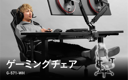 ◆商品内容◆ ────────────── ■ゲーミングチェア(G-571-WH) 【サイズ】 ・サイズ:幅70cm × 奥行64.5~111cm × 高さ97~135cm ・耐荷重:100kg ・座面サイズ:約35→40cm ・座部クッション厚(cm):12 ・座面高:43.5ー55.5 ・推奨身長(cm):158ー206 【素材】 背部・座部:金属(スチール) アームレスト:ナイロン・ポリウレタン・金属(スチール) 座受金属部、ガスシリンダー:金属(スチール) 脚部:ナイロン キャスター:ナイロン・金属(スチール) 張り材:ポリエステル 背部・座部:ウレタンフォーム ヘッドレスト・ランバーサポート:ポリエステル綿