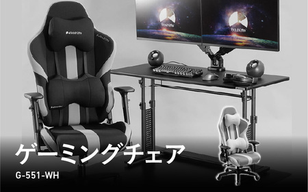 ◆商品内容◆ ────────────── ■ゲーミングチェア(G-551-WH) 【サイズ】 ・サイズ:幅65cm × 奥行64~110cm × 高さ96~129cm ・耐荷重:100kg ・座面サイズ:約34→41cm ・座部クッション厚(cm):8.5 ・座面高:40ー47.5 ・推奨身長(cm):154ー182 【素材】 背部・座部:金属(スチール) アームレスト:ナイロン、ポリウレタン、グラスファイバー、金属(スチール) 座受金属部、ガスシリンダー:金属(スチール) 脚部:ナイロン キャスター:ナイロン、金属(スチール) 張り材:ポリエステル 背部・座部:ウレタンフォーム ヘッドレスト・ランバーサポート:ポリエステル綿