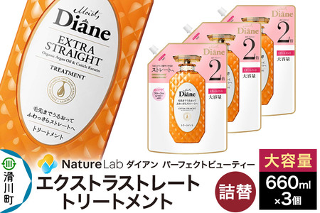 ■名称:モイスト ダイアン パーフェクト ビューティー エクストラストレート トリートメント 詰め替え 大容量セット ■内容量:660ml×3 ■原材料:画像に記載 ■使用方法:(1)シャンプー後、軽く髪の水気をきります。 (2)適量を手にとり、髪全体になじませます。 (3)しばらく置いた後、よくすすいでください。 シリーズでお使い頂くと、より一層効果的です。 ■注意事項: 〈ご使用上の注意〉 ※頭皮に傷、はれもの、しっしん等、異常のある時は、ご使用にならないでください。 ※使用中や使用後に、赤み、はれ、かゆみ、刺激等の異常が現れた時は使用を中止し、皮膚科医へ相談してください。 使い続けると症状が悪化することがあります。 ※目に入らないようにご注意ください。 ※目に入った場合は、こすらずにすぐ洗い流してください。 ※目に異物感が残る場合は、眼科医にご相談ください。 ※ふるさと納税(寄附申込み)のキャンセル、返礼品の変更・返品はお受けできません。あらかじめご了承ください。 ■提供元:株式会社ネイチャーラボ ■配送不可地域:離島 ■地場産品に該当する理由:町内の製薬工場にて化学製品・着色料・芳香剤等の調合作業によるバルク製造及び容器への充填・包装作業を行っている。(告示第5条第3号に該当)