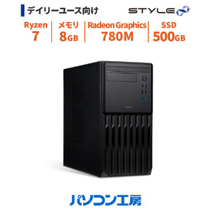 OS:Windows 11 Home 形状:ミニタワー / microATX CPU型番:Ryzen 7 8700G CPUクーラー:空冷CPUクーラー グラフィックス:Radeon 780M メモリ規格:DDR5 メモリ容量:8GB(8GB×1) 1stストレージ:500GB NVMe対応 M.2 SSD 光学ドライブ:光学ドライブ非搭載 有線LAN機能:1000BASE-T 無線機能:非搭載 キーボード:日本語キーボード マウス・ポインティングデバイス:光学式マウス 電源:550W 80PLUS BRONZE認証 ATX電源 外部端子(前面):ヘッドフォン端子×1 ,マイク端子×1 ,USB 3.0×2 ,USB 2.0×2 外部端子(背面):アナログ6chサウンド(ライン出力×1/ライン入力×1/マイク入力×1) ,USB 3.0×3(Type-A×2/Type-C×1) ,USB 2.0×2 ,1000BASE-T LANポート×1 ,マザーボード側ディスプレイ出力(DisplayPort×1/HDMI×1)