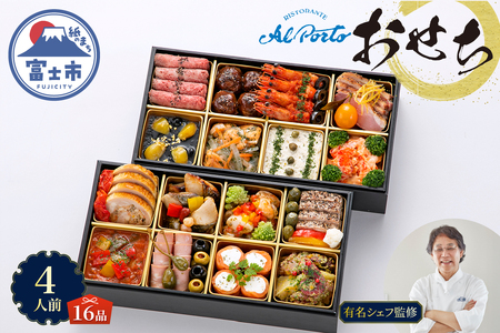 オードブル おせち お正月 2026 豪華 海鮮 魚介 肉 リストランテ アルポルト イタリアン 二段 華やか 期間限定 数量限定 16品 4人前 お酒に合う ワンランク上 有名シェフ監修 冷蔵 富士市 [sf093-008]