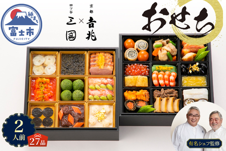 オードブル おせち お正月 2026 和食 豪華 海鮮 魚介 肉 京都𠮷兆×オテル・ドゥ・ミクニ フレンチ 和洋 二段 華やか 期間限定 数量限定 27品 2人前 お酒に合う ワンランク上 有名シェフ監修 冷蔵 富士市 [sf093-009]