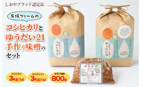 ≪先行受付≫有坂ファームの令和7年産コシヒカリとゆうだい21(3kg×2)・手作り味噌(800g)のセット(しおやブランド認定品)
