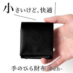 商品名:手のひら財布-Beh- 素材:牛革(オイルレザー)/栃木レザー カラー:ブラック(黒糸) 縦9.5cm×横8.5cm×厚み2.0~3.0cm ※おおよそのサイズになります。 質量:約70g 仕様:カード用スペース×1、お札用スペース×1、コインスペース×1 お届けの内容:本体/取扱説明書