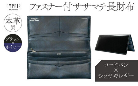 キプリス本革製コードバンxシラサギレザーファスナー付きササマチ長財布 カラー:ブラックxネイビー