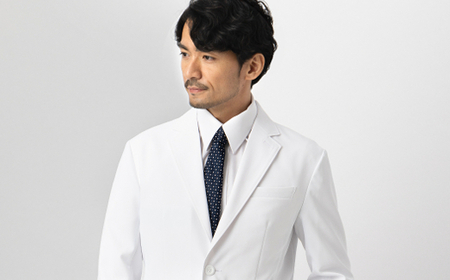 メンズの白衣「テーラードカラードクタージャケット」1着 (表地:ポリエステル100%、裏地:ポリエステル100%) ※カラー:白 ※サイズ:46サイズ ※【左袖】または【左胸】にネーム刺繍入り 2段24文字(1段あたり12文字まで)