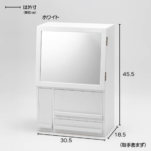 ■色:ホワイト ■サイズ:約幅30.5奥行18.5高さ45.5cm・重さ約4.5kg ■素材:MDF(ラッカー塗装)、ミラー ■日本製※鏡は仕様上、多少傾いた状態で取り付けております。予めご了承ください。