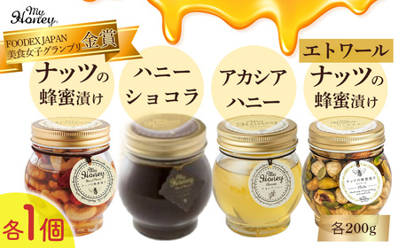 ナッツの蜂蜜漬け(200g)・アカシアハニー(200g)・ハニーショコラ(200g)・エトワール(200g) 各1個 消費期限:蜂蜜漬け 1年6カ月 アレルギー品目 くるみ、アーモンド、カシューナッツ
