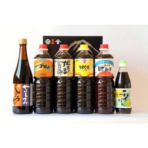 ・さしみしょうゆ 甘露:360ml瓶×1本 ・こいくちしょうゆ丸大豆:500ml×1本 ・なんでもだししょうゆ:360ml瓶×1本 ・ぽん酢しょうゆ 橙ぽん:360ml瓶×1本 ・塩ポンズ:360ml瓶×1本 【賞味期限】 【賞味期限】 1年~2年 【アレルギー】 小麦、大豆 ※ 表示内容に関しては各事業者の指定に基づき掲載しており、一切の内容を保証するものではございません。 ※ご不明の点がございましたら事業者まで直接お問い合わせ下さい。