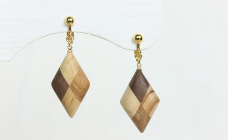 寄木細工のイヤリングです。 金具はゴールドメッキです。 材種:モアビ、クリ、ナラ、サクラ、シオジ、スギ、ヒノキ、ミズメ、コクタン等手元にある材料で製作しています。