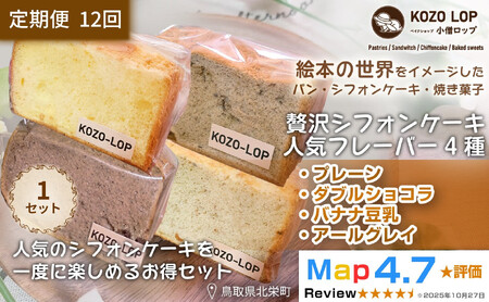 1245.【定期便12ヶ月】鳥取県産 シフォンケーキ 人気フレーバー4種 プレーン・ダブルショコラ・バナナ豆乳・アールグレイ 1セット 12回