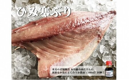 ひみ寒ぶり(8~10kg台物)半身・アラ・カマも1尾の半量 (ご要望あれば、刺身用サク・焼き物用・しゃぶしゃぶ用などご希望の状態に加工致します) 別撰こいくちしょうゆ(100ml)