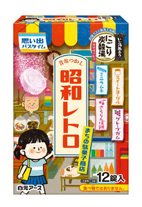 いい湯旅立ち にごり炭酸湯 入浴剤 4種の香り 24回分 全2箱 各12錠入り 昭和レトロまちの駄菓子商店 お試しセット【医薬部外品】 ・いい湯旅立ちにごり炭酸湯 昭和レトロまちの駄菓子商店(クレープガムの香り、ミニラムネの香り、スイートヨーグルトの香り、さくらんぼ餅の香り)×2箱 【成分】 炭酸水素Na*、炭酸Na*、硫酸Na*、コハク酸、デキストリン、PEG6000、流動パラフィン、酸化Ti、チンピエキス、ショウキョウチンキ、無水エタノール、ケイ酸Ca、香料、(+/-)赤106、青1、青2 *は「有効成分」無表示は「その他の成分」 シリーズ名:いい湯旅立ちにごり炭酸湯 ブランド名:白元アース 入浴剤の種類:バブルバス 【使用期限・保存方法】 使用期限:製造日より3年 保存方法:高温多湿の場所に保管しないでください。アルミパック開封後はすぐにお使いください。