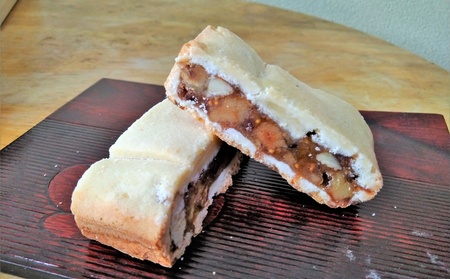 干し柿とイチジクと胡桃のエンガディーナ 10個 箱入り (1個:2.5cm×7.5cm) ※はちみつを使用しているため、1歳未満の乳児には与えないでください。 【アレルギー】 卵、乳成分、小麦、アーモンド、くるみ 本品製造工場ではオレンジ・りんごを含む製品を製造しています。