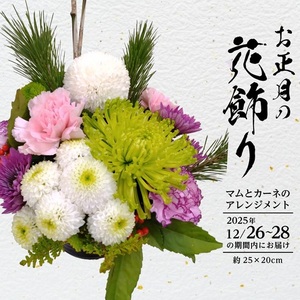 お正月飾りのアレンジメント(生花) グリーンマム、白菊、カーネーション、松、寒竹、千両等 サイズ:高さ約25cm×幅約20cm