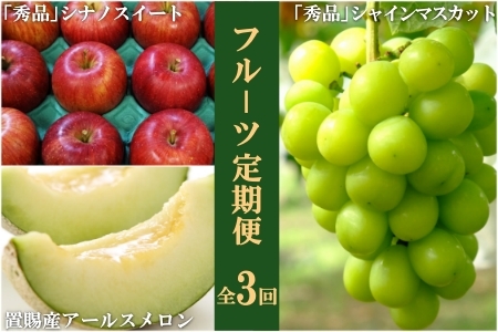 1回目:マスクメロン(アールスメロン)(1.75kg~2.0kg×2玉) 2回目:「秀品」シャインマスカット(2kg・2~5房) 3回目:「秀品」シナノスイート(5kg・14~20玉)