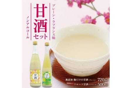 無添加 麹だけの甘酒720ml ×1本 名称:清涼飲料水 原材料名:米麹(国産米) フルーツ甘酒ラフランス味500ml×1本 名称:清涼飲料水 原材料名:米麹(国産米)、ラフランス添加物、酸味料(クエン酸)、酸化防止剤(ビタミンC)