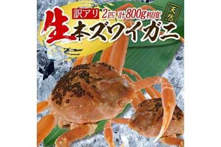 名称:生・本ズワイガニ 2匹 計800g程度(1~2本足折れ) ※訳あり品です(1~2本足が取れたカニです) 産地:山形県遊佐沖 天然・養殖:天然 配送中に水分が抜け、最大2割程度の重量が減少する場合があります。 出荷時には1匹ずつ検品し梱包させていただきますが、輸送中の衝撃などから爪折れや足が外れている場合があります。
