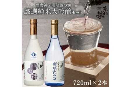 (1)純米大吟醸 雪女神 720ml 原料米:米(山形県産雪女神) 精米歩合:40% 日本酒度:+1 アルコール度:16.5% (2)純米大吟醸 瑠璃色の海 720ml 原料米:米(雄町) 精米歩合:45% 日本酒度:+1 アルコール度:16.2% 蔵元:合資会社高橋酒造店