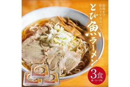 名称:冷凍とび魚ラーメン 内容量:3食セット(麺、具、スープ) 原材料名: [生麺]小麦粉(国産製造)、食塩、かんすい [スープ]醤油(国内製造)、酒類、煮干し、干しえび、するめ、豚骨、もみじ、背油/調味料(アミノ酸等) [具]豚肉(国産)、メンマ(たけのこ(中国))、醤油、砂糖、植物油、食塩、酵母エキス/調味料(アミノ酸等)、酸味料 (一部に小麦・大豆・豚肉・鶏肉・えび・いかを含む)