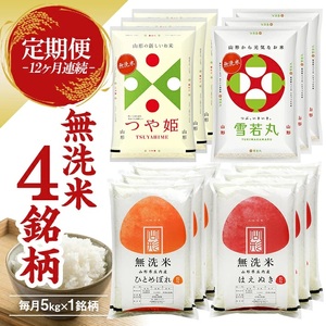 1350T02 【定期便】無洗米4銘柄定期便 5kg×12ヶ月連続 計60kg(2月~1月)はえぬき つや姫 雪若丸 ひとめぼれ
