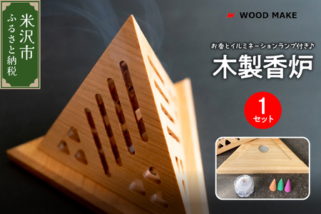 1セット ・木製香炉1個 ・イルミネーションランプ1個(ランプの色が変化します。電池付) ・お香3個(ローズ、サンダルウッド、ジャスミン各1個)
