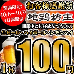 10/6~10/9までは生ビール・ハイボール・レモンハイを1杯100円でご提供◎期間中はもちろん何杯飲んでもOK! ■おすすめご宴会飲み放題付きコース ▼季節の素材と地鶏のコース料理2980円〜豊富にご用意。 ■名古屋コーチン・奥三河地鶏を使用した逸品料理 純血100%、日本三大地鶏の一つ。 ...View More »