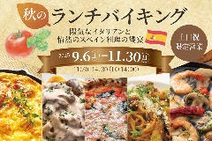 【土日祝】9月6日~11月30日!期間限定『秋のランチバイキング』開催★ランチバイキング90分制 秋のランチバイキング開催!! 陽気なイタリアンと情熱のスペイン料理の饗宴 <開催期間> 期間:9月6日(土)~11月30日(日)の期間 土日祝 限定営業 時間:AM 11:30 ~ PM14:...View More »