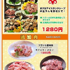 【当日予約OK!】忘年会にも最適! サフォーククロスラム肉のジンギスカンコース全7品 5,000円(120分飲み放題付き)栄養価が高く柔らかく旨み溢れるジューシーなラム肉を使用したジンギスカン鉄板焼きがメインの人気のコースです。その他、ご予算に合った宴会コース各種ご用意しております。 ランチタ...View More »