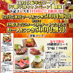 【11月限定キャンペーン】 これはお得!当日来店でも対象! 黒毛和牛堪能コース & 黒毛和牛づくしコース どちらのコースもなんと3時間飲み放題に! さらに!4名様以上でのご来店&クーポン提示にて 玉者の炙りユッケ 1,980円相当も無料! キャンペーン期間:11月1日〜11月30日まで ※他ク...View More »