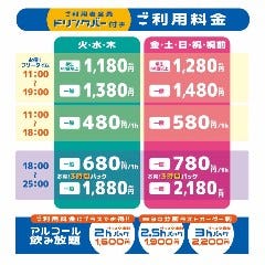 【火・水・木の料金】 《11時~19時お得!フリータイム》 ・学生・60歳以上:1180円 ・一般:1380円 《11時~18時:1時間毎》 ・一般 :1時間/480円 《月曜18時~25時》 ・一般【1時間毎:680円【お得3時間パック】:1880円 【金・土・日・祝・祝前の料金】 《11時...View More »
