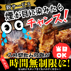 ◆煙が目に染みたらスタッフにお声がけください! 通常2時間の飲み放題がなんと『時間無制限』にグレードアップ◎ ※12月は上記サービスは中止となります。ご了承くださいませ。 ◆自慢の豚ホルモンと牛ハラミ 2時間じっくり煮込んで臭みを取り、特製ダレを絡めた豚ホルモン。 本当に旨いものを厳選し、新鮮...View More »