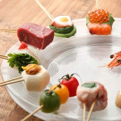 阿波尾鶏のたたきや自家製白肝のパテといった逸品や 鶏、チーズ、野菜など種類豊富な串焼きが人気 5種のワインを試せる飲み比べセットもオススメです! 各種飲み会やお集まりの際にはおまかせコースをぜひご利用くださいView More »