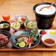 一六茶寮の定食は、新鮮な野菜をそのままジュースにした食前メニュー「グリーンジュース」に、主菜と小鉢3種、十八穀米のご飯、豚汁付き。さらに「土鍋おぼろ豆ふ」か「野菜せいろ蒸し」のどちらかをお選びいただけます!なんばダイニングメゾン「オンザスクエア」、グランフロント大阪「おぼん食堂 16」の姉妹店です。View More »