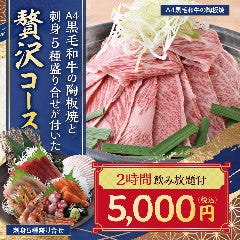 ■魚に本気の五選 ・赤鉄火(まぐろ)とまぐろたたき ・白鉄火(びんちょうまぐろ)とまぐろたたき ・サーモンといくら ・大盛りまぐろの煮付け ・具沢山!!お刺身サラダ ■お料理もセットでおすすめ!2時間飲み放題付きコース ≪イチ押し≫ ・A4黒毛和牛の陶板焼が付いた贅沢コース【全8品】5,000...View More »