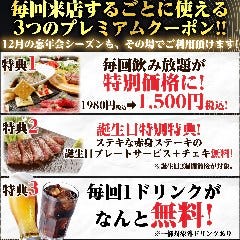 【毎回来店するごとに使える3つのプレミアムクーポン!】 12月の忘年会シーズンも、その場でご利用頂けます! <特典①> 毎回飲み放題が特別価格に! 1,980円(税込)⇒1,500円(税込) <特典②> 誕生日特別特典! ステキな赤身ステーキの 誕生日プレートサービス+チェキ無料! ※誕生日2...View More »