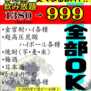 【16~19時は毎日ハッピーアワー!】 ドリンク半額!お料理も安い!生牡蠣半額!550円→275円 【19時~2H飲み放題1380円(税込1518円)!】 色んなドリンクが飲み放題として楽しめます♪ 【ご宴会コース】 ★2h飲み放題付き忘年会もつ鍋コース★ 4500円(7品)/5000円(7品...View More »
