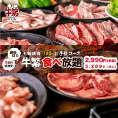 ◇◆ 食べ放題コースは3種類ご用意 ◆◇ 2時間制の食べ放題!おひとり様からOK! 小学生は半額!小学生未満は無料で!! ---------------------------- ・お手軽コース/3,289円(税込) ・牛繁コース/3,839円(税込) ・プレミアムコース/4,939円(税込)...View More »