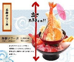 【海鮮丼専門店】インパクト抜群なタワー丼は是非お召し上がりいただきたい一品。 タワー丼には高さ約30cmもある海鮮タワー丼や、大きすぎてお重からはみ出す「はみ出しうな重」など ここでしか味わえない丼メニューも揃えております! 【テイクアウトメニュー販売中!】 約20cmの特大海老天が2本ものっ...View More »